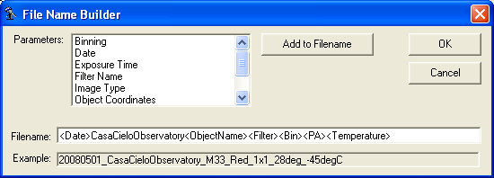 Select the parameter you wish to add from the list, and then click the Add to Filename button. This will append the selected parameter into the Filename text box.