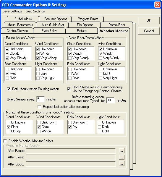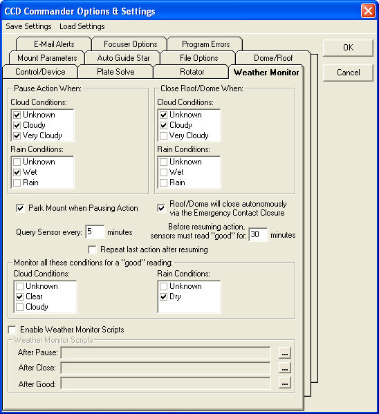 The Enable Weather Monitor Scripts allows for custom scripts for each weather event to be setup. CCD Commander will execute the specified script after each of the three possible weather events: Action List Paused, Dome Closed, Good Condition Detected.