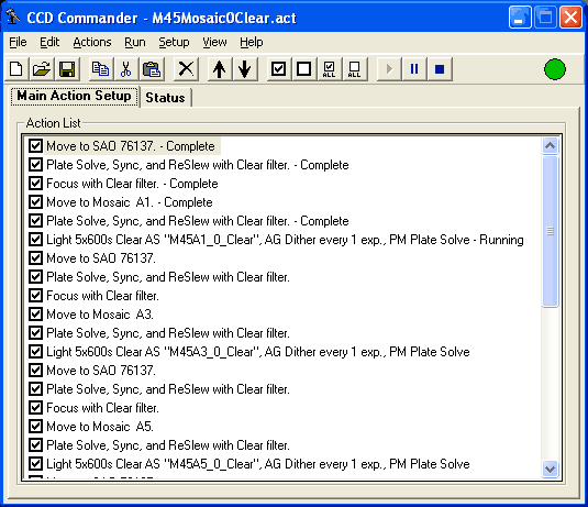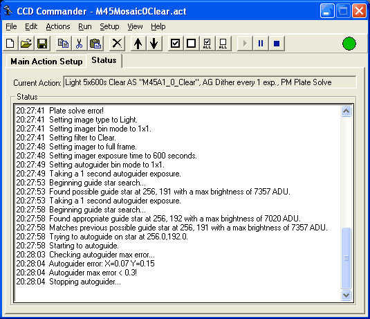 This is the CCD Commander main window, showing the Status tab. This is where you monitor your action list while it runs. At the top of the window, CCD Commander displays the current executing action. In addition, the Green circle flashes while the action is running to let you know that everything is proceeding as normal! In the status window you can see there are a number of messages displayed indicating each thing CCD Commander does. Above you can see that CCD Commander is searching for a guide star. It found a guide star that met the current settings, and was successful guiding on the star. While the action is running, you can still go back and view your action list. If you see a mistake, you can edit any action that has not already run, or is in the process of running. This functionality allows you to create and modify your action list while it is running!