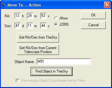 All of the windows in CCD Commander have been designed to simplify parameter entry. Above is the Move To Action window. The buttons on this window allow you to pull the cooridnates into CCD Commander without entering a single number. You can click on an object in TheSky, or search for one of TheSky's objects. CCD Commander will get the proper coordinates (either J2000 or JNow) and put them into the window! Alternately if you have perfectly framed an object using your telescope and camera, you can have CCD Commander pull the exact coordinates from your telescope! |